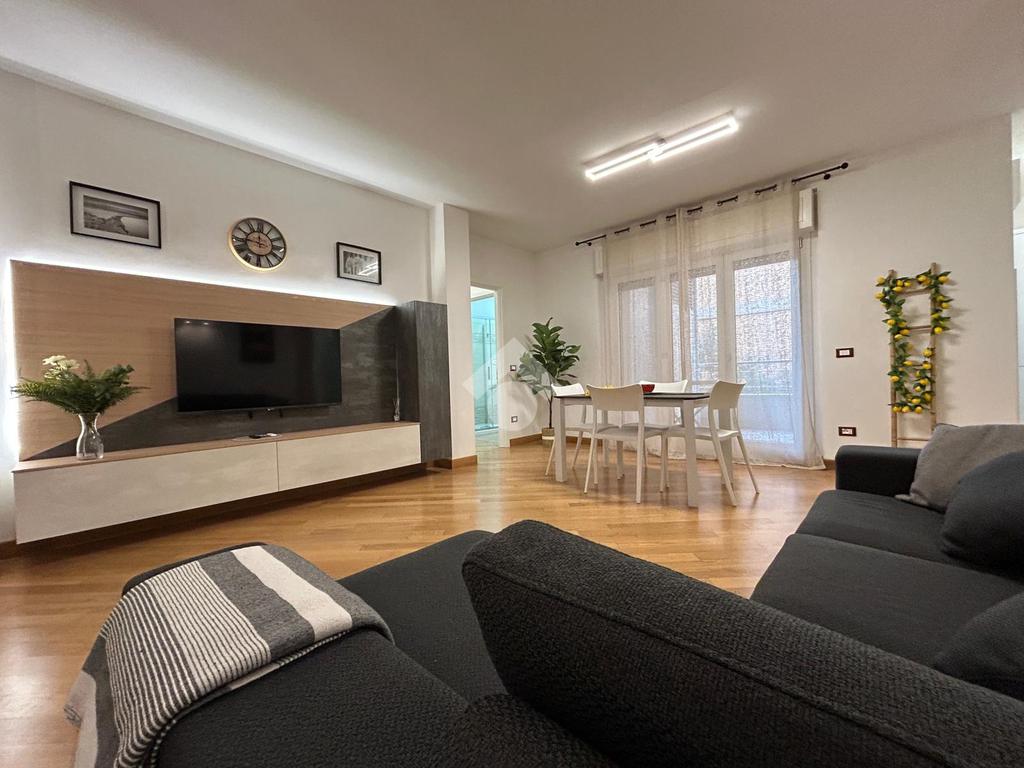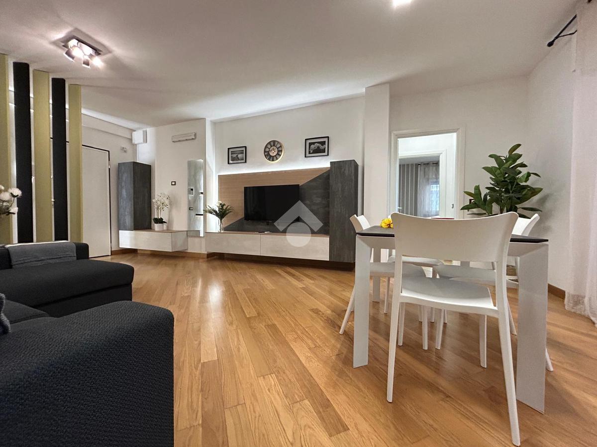 Ampio soggiorno con cucina a vista, completamente attrezzata con lavastoviglie, frigorifero, forno, micronde e piano cottura.