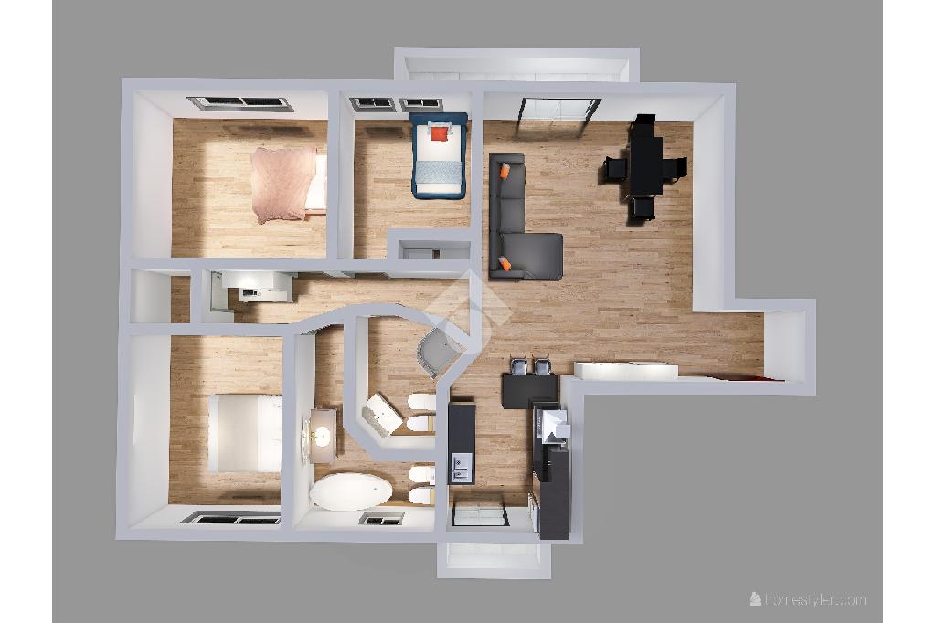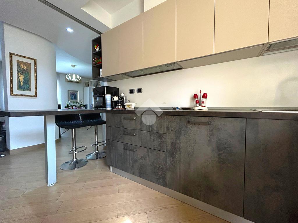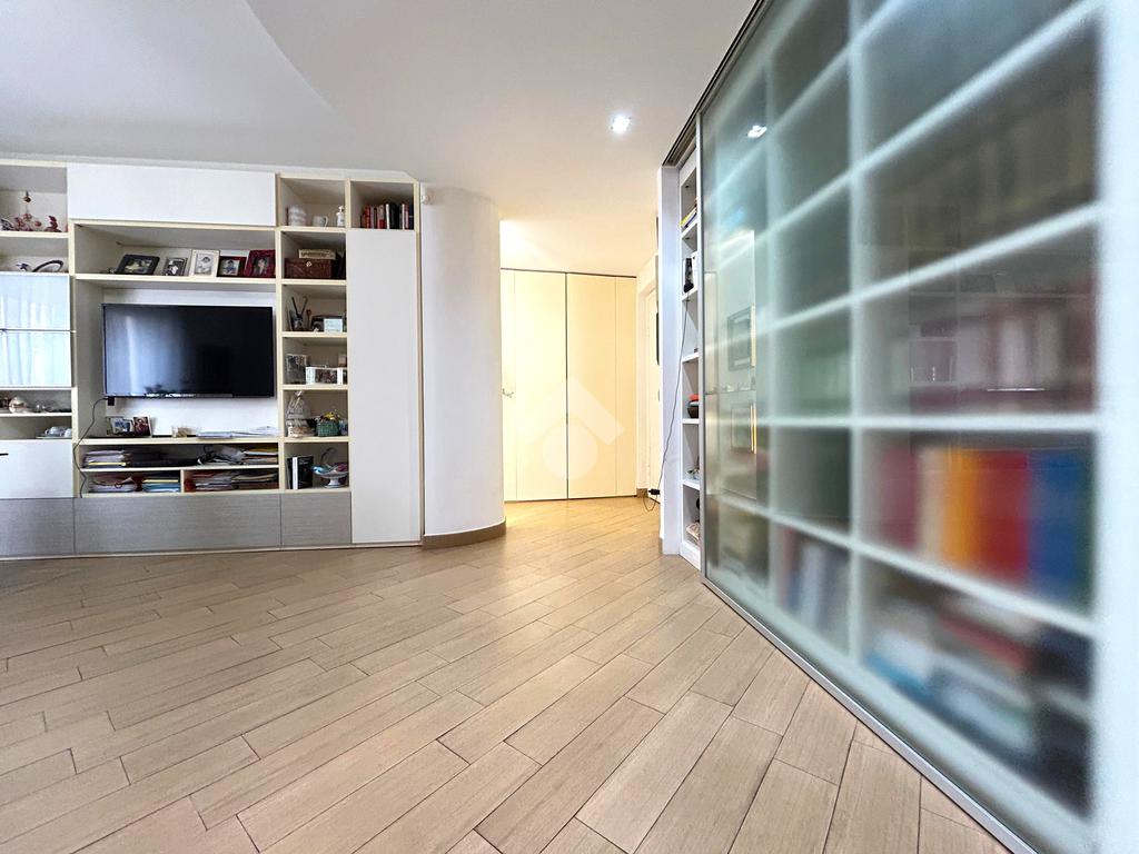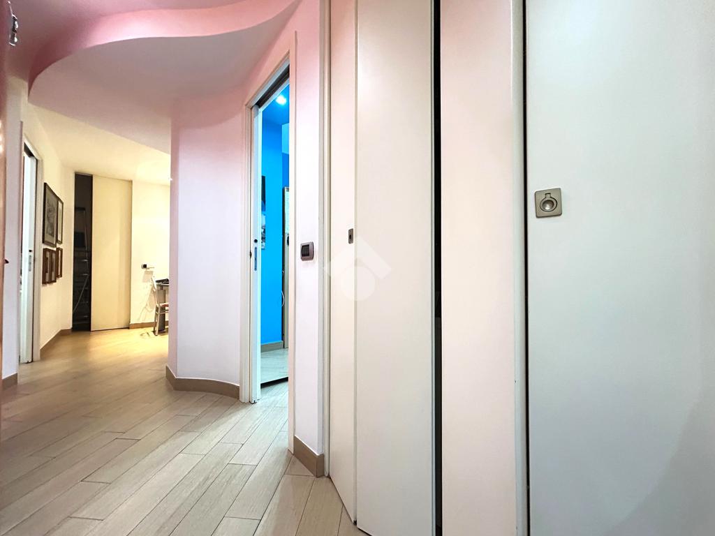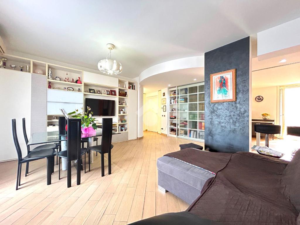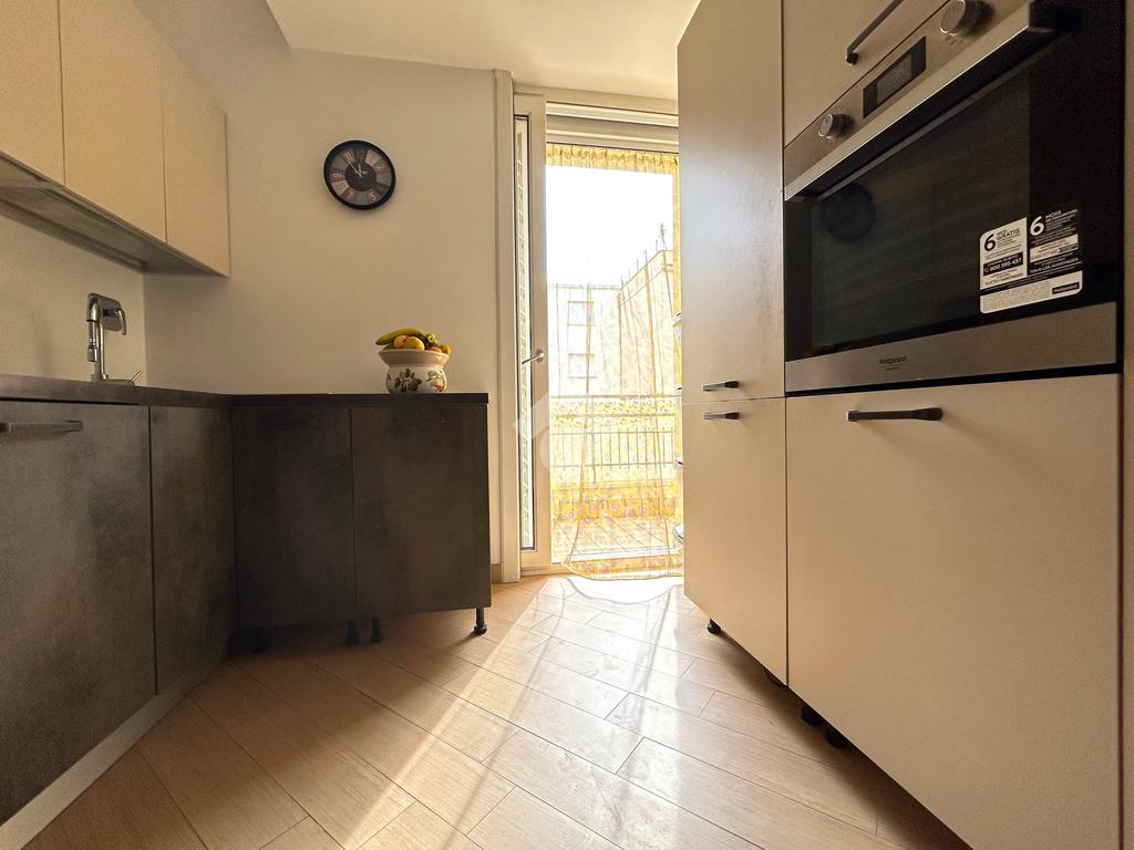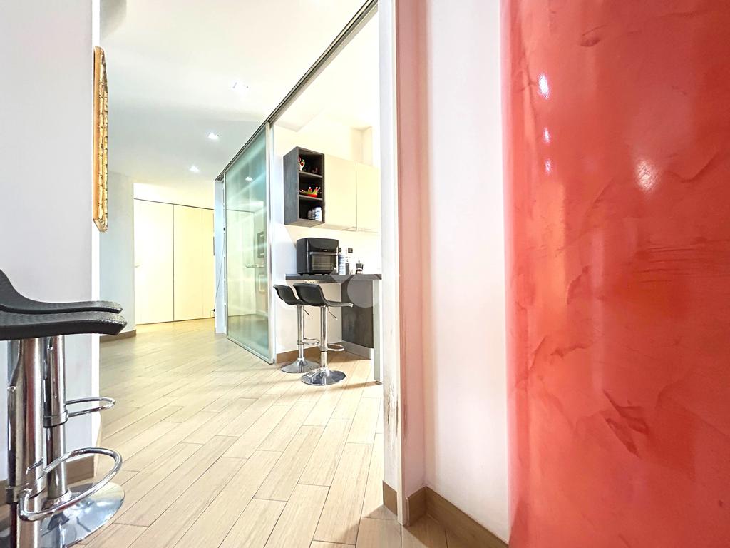 L’ingresso, dotato di un comodo guardaroba a muro, si apre sulla zona living ampia e luminosa, con accesso diretto al balcone. La cucina angolare, semi a vista, è ben integrata ma può essere separata tramite una raffinata vetrata scorrevole, offrendo così flessibilità e stile. Anche la cucina dispone di un secondo balcone.