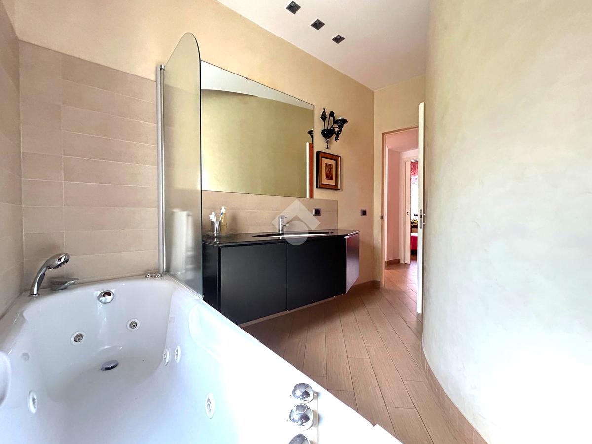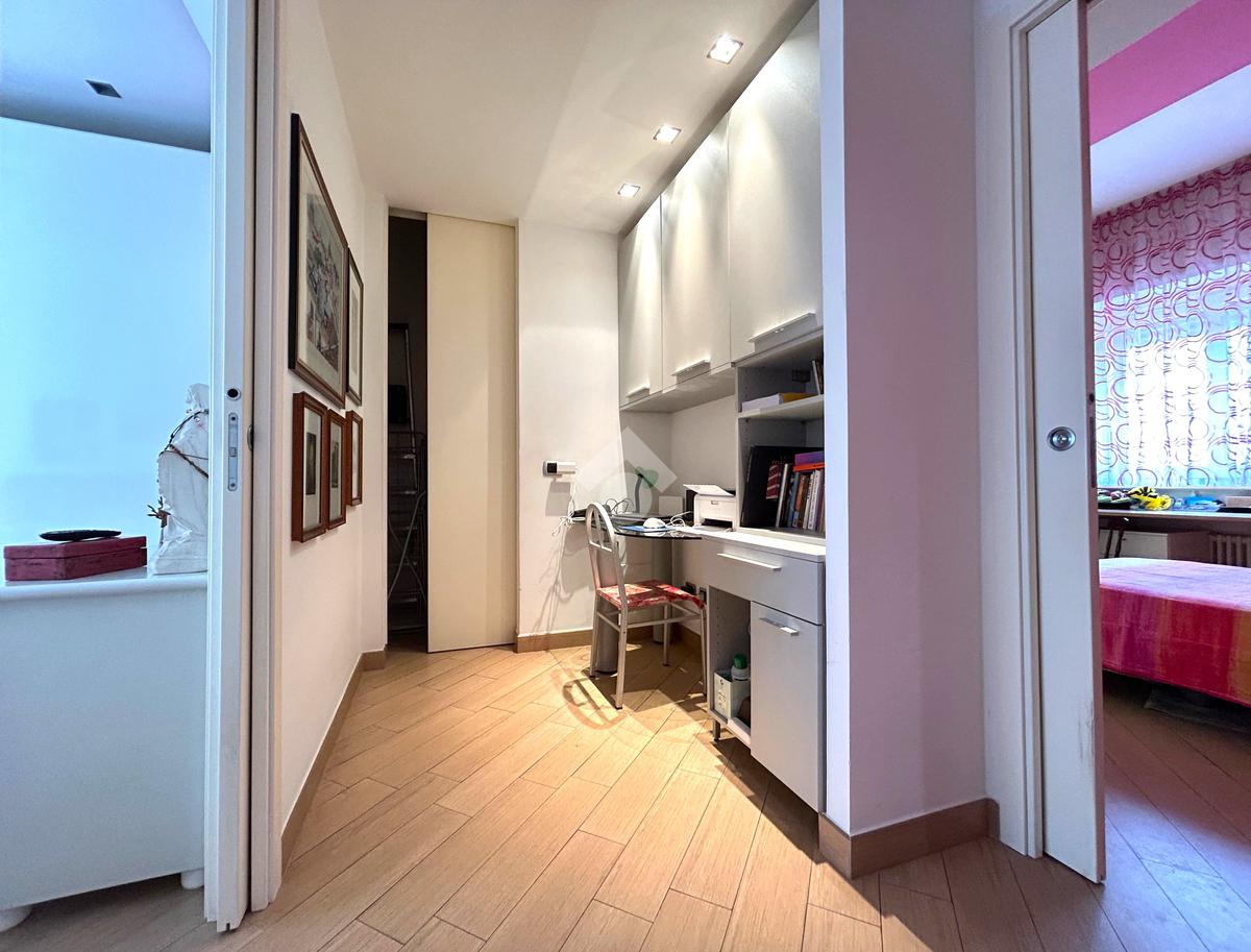 La zona notte comprende tre camere da letto, due bagni elegantemente rifiniti in mosaico; uno con vasca, l’altro con doccia, e un angolo studio ideale per il lavoro da remoto. Non mancano un pratico ripostiglio completo di zona lavanderia.
